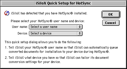 start iSiloX, you get the Quick Setup for HotSync® dialog