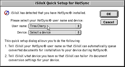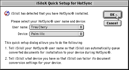 start iSiloX, you get the Quick Setup for HotSync® dialog