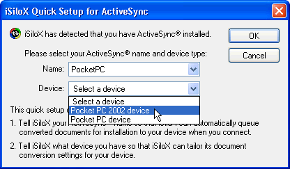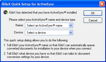 start iSiloX, you get the Quick Setup for ActiveSync® dialog